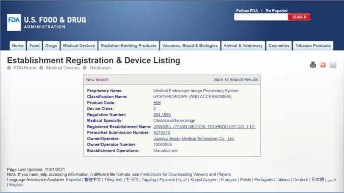 1、一次性電子宮腔鏡及醫(yī)用圖像處理系統(tǒng)獲得美國FDA注冊